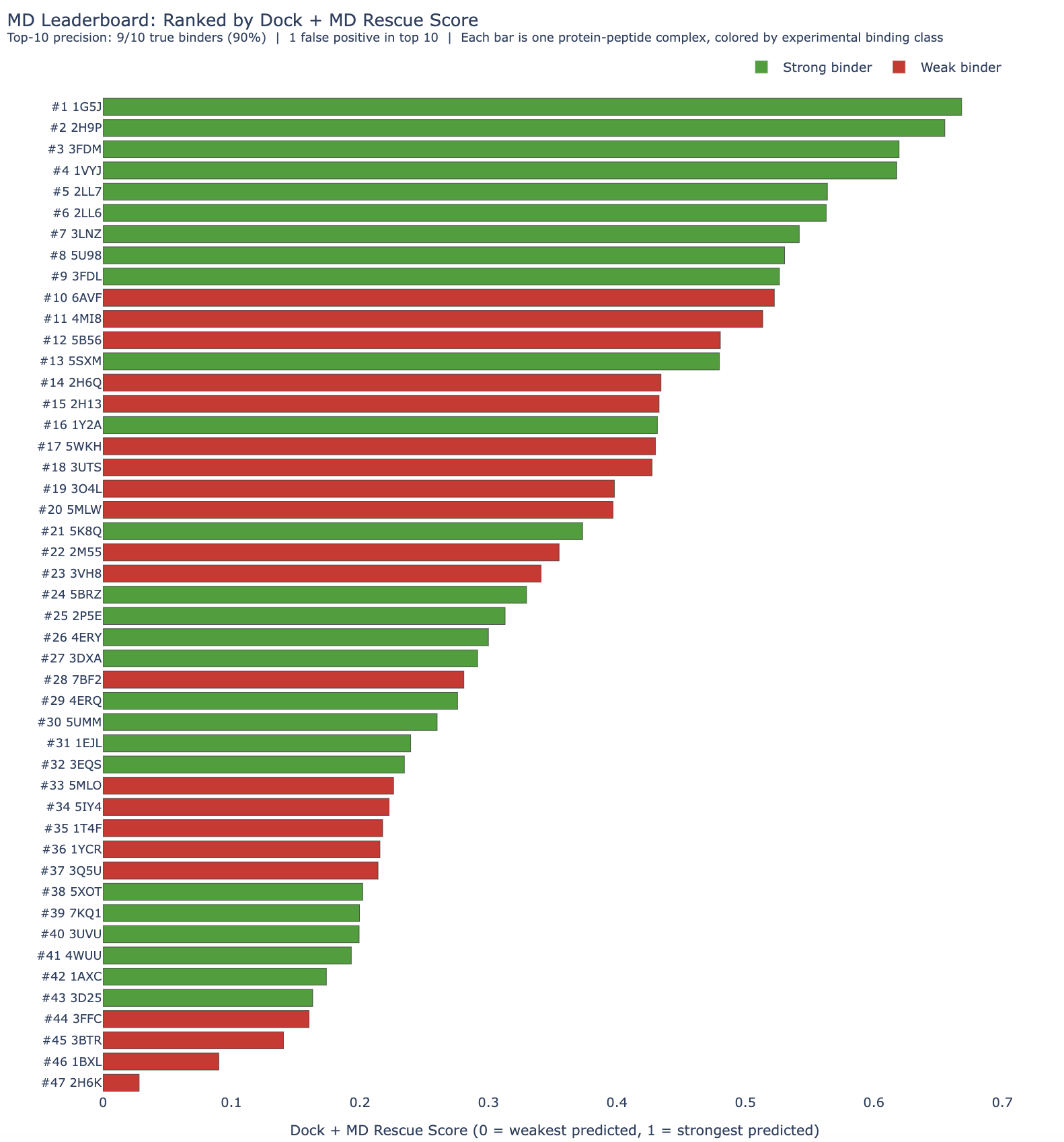 On this 47-complex benchmark, combining HADDOCK3 docking with MD rescoring improved early ranking: it recovered 9 of the top 10 true binders, compared with 7 of 10 for docking alone. That increased top-10 precision from 70% to 90% and avoided two failed assays. Assuming $500 per sequence tested, that corresponds to about $1,000 in wet-lab savings.