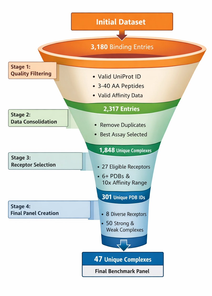Our goal was to build a benchmark dataset spanning diverse protein receptor families, with each receptor having an equal number of true and false peptide binders supported by experimentally validated binding data. To do this, we curated entries from the Protein-Peptide Interaction Knowledge Base (PPIKB)[2], filtering the original 3,180 experimental binding entries down to a final set of 47 complexes used in this study.